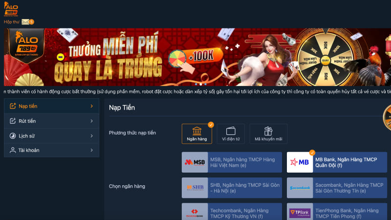 Bạn chỉ mấy tối đa 30 giây để nạp tiền và 1 phút để rút tiền thẳng về tài khoản ngân hàng. Nhà cái hoàn toàn miễn phí tất cả các giao dịch có tại website vì thế, bạn có thể yên tâm thanh toán với các phương thức như: I-Banking, QR Pay, ATM, USDT, Ví điện tử,...