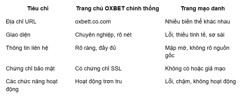 Dưới đây là các dấu hiệu rõ ràng giúp bạn phân biệt link chính thống của OXBET: